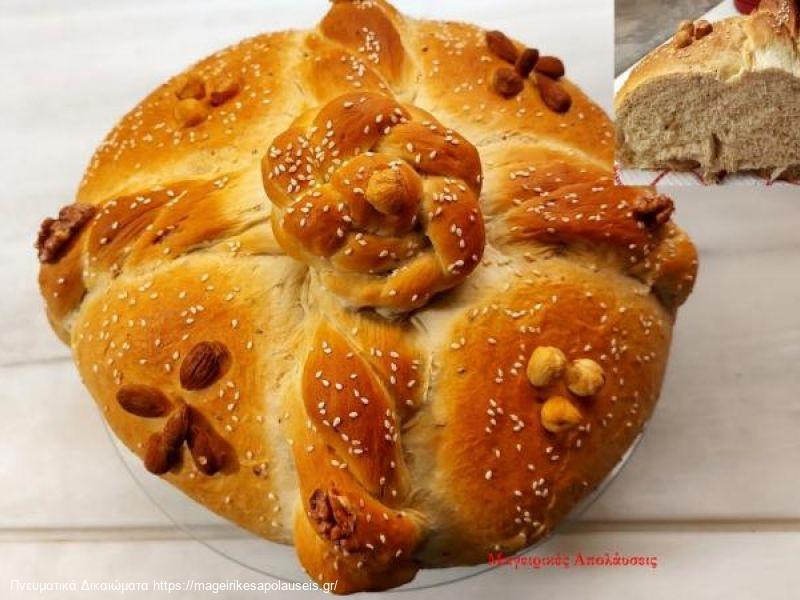 Βάζουμε όλα τα υλικά μαζί εκτός των ξηρών καρπών και ζυμώνουμε για πέντε λεπτά. Αφήνουμε την ζύμη να ξεκουραστεί και έπειτα αφού πάρουμε ένα κομμάτι φτιάχνουμε καρβέλι. Με το κομμάτι κάνουμε σχέδια επάνω στο καρβέλι και τέλος ψεκάζουμε με ζάχαρη και νερό και ψήνουμε σε προ θερμασμένο φούρνο αντιστάσεις για 1 ώρα περίπου.