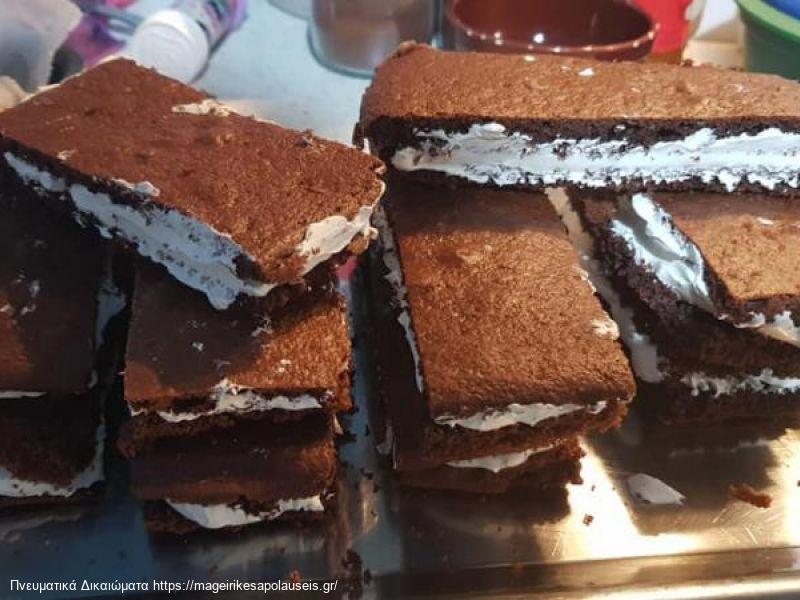 Όταν κρυώσει καλά το παντεσπάνι το κόβουμε σε λωρίδες και μετά ξανά στη μέση, σαν παστάκια. Μετά κόβουμε το κάθε παστάκι στη μέση και απλώνουμε στο μισό την κρέμα. Βάζουμε από πάνω το άλλο κομμάτι παντεσπάνι, καλύπτουμε και τα κενά στο πλάι με κρεμούλα και έτοιμο το γλυκάκι μας.