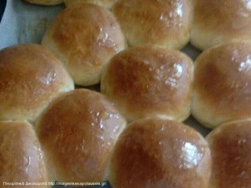 Σε κατσαρόλακι, βάζουμε το γάλα και το βούτυρο σε χαμηλή θερμοκρασία, να λιώσει το βούτυρο. Αποσύρουμε και ρίχνουμε το νερό και ανακατεύουμε. Ρίχνουμε και τους κροκους και ανακατεύουμε πολύ γρήγορα. Σε μια λεκάνη τσα, βάζουμε το αλεύρι, τη μαγιά, το αλάτι και τη ζάχαρη. Ανακατεύουμε με ένα αβγογδαρτη, να αναμιχθούν τα υλικά. Βάζουμε το μίγμα της κατσαρόλας σε μια λεκάνη, και ρίχνουμε το μισο μίγμα του αλευρου, δημιουργώντας ένα παχύ χυλό. Σκεπάζουμε με μεμβράνη, και αφήνουμε να 2στει σε όγκο. Μόλις γίνει προσθέτουμε και το υπόλοιπο μίγμα του αλευρου κι ζυμώνουμε καλά γύρω στο 25 λεπτό. Όσο ζυμώνουμε η ζύμη δένει και ξεκολλάει από τα χέρια. Το Αποτέλεσμα είναι μια πολύ μαλακή ζύμη. Αφήνουμε να 2στει σε όγκο, σκεπασμένη με μεμβράνη. Όταν είναι έτοιμη κόβουμε σε κομμάτια, (13),κανουμε μπαλακια, βάζουμε στο ταψί, και τα πατάμε λίγο με το χέρι μας, να πλατυνουν. Αφήνουμε να 2στουν.Προθερμασμενος φουρνος, αντιστασεις, 210 βαθμούς για 15 λεπτά ή ώσπου να ροδίσουν.Μόλις τα βγάλουμε από το φούρνο, τα αλείφουμε με Βούτυρο ή μαργαρινη.