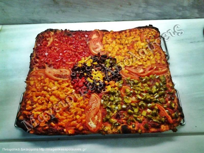 Ανοίγουμε το ζυμάρι σε μεγάλο ταψί χρησιμοποιούμε νισεστέ όχι αλεύρι. (Ο νισεστές δεν μπαίνει μέσα στην ζύμη όπως το αλεύρι θωρακίζει το ζυμάρι για να το απλώσουμε). Βάζουμε το ζυμάρι σε λαδόκολλα ρίχνουμε όση σάλτσα θέλουμε και στολίζουμε όπως εμείς θέλουμε εγώ απλά σας δείχνω μια εκδοχή εσείς μπορείτε να στολίσετε όπως θέλετε