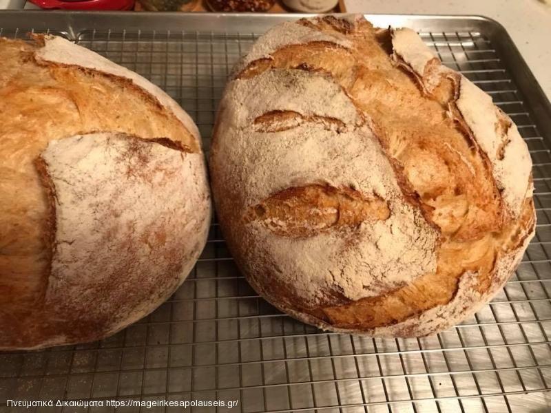 Αφού τελειώσω το πέμπτο δίπλωμα το αφήνω το διπλώνω το αφήνω να ξεκουραστεί γύρω στη μισή ώρα με 45 λεπτά Αφού φουσκώσει γύρω στα 30 με 40 τα εκατό το ψωμί μου το πλάθω μέσα σε πάνερακια και αφήνω να φουσκώσουν πάλι εκεί χρειάζεται γύρω στις δύο με δυόμισι ώρες αν το δωμάτιο είναι ζεστό θέλει λιγότερο εγώ ανάβω το φως της κουζίνας και αφήνω το ψωμάκι με τις πανερακια να φουσκώσει εκεί μέσα μετά το βγάζω και το αναποδογυρίζω σε καυτές γάστρας το ψήνω στους τους 275 βαθμού Για 20 με εικοσιπέντε λεπτά ανοίγω το καπάκι και αφήνω για άλλα 30 λεπτά ανάλογα με το φούρνο θα δει κάθε νοικοκυρά το χρώμα του ψωμιού εμένα μαρέσει να έχει ένα καραμελωμένο ωραίο χρυσαφένιο χρώμα αυτά αγάπες μου εύχομαι να το φτιάξετε αξίζει τον κόπο είναι πολυάσχολο είναι χρονοβόρο ψωμάκι αλλά δεν αλλάζετε με τίποτα εκεί έξω στην αγορά φιλάκια αγάπες μου και καλές επιτυχίες μας και καλά μας μαγειρέματα