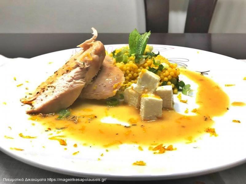 Κοτοπουλο με κουσ-κους μυρωδικα μανουρι και σαλτσα πορτοκαλιού