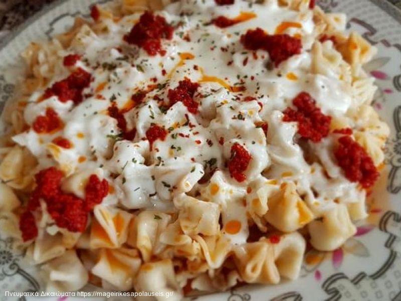 Κάνουμε μια πολύ σκληρή ζύμη.σκεπαζουμε με σελοφάν και την αφήνουμε να ξεκουραστεί μια ώρα. Βράζουμε τις πατάτες, καβουρδιζουμε ένα κρεμμύδι βάζουμε μια κουταλιά πολτό ντομάτας και μετά με τον τρίφτη ρίχνουμε και τις πατάτες μέσα. Ανακατεύουμε και έχουμε την γέμιση. Κόβουμε τη ζύμη δύο ή τρία μεγάλα κομμάτια. Μετά ανοίγουμε το φύλλο όσο πιο λεπτό γίνεται. Με ένα ποτήρι κόβουμε κύκλους και δίνουμε σχήμα. Ρίχνουμε μέσα σε βρασμένο και πολύ αλατισμένο νερό. Προσοχή μην τα ρίξετε όλα μαζί γιατι θα λασπωσουν. Λίγα λίγα. Γενικά ως συνήθως όταν είναι έτοιμα ανεβαίνουν στην επιφάνεια. Αλλά μπορείτε να τα βράσετε όσο θέλετε. Σε ένα τηγάνι βάζουμε ελαιόλαδο και μια κουταλια πολτό ντομάτας και τηγανίζουμε για λίγο μέχρι να χωριστεί και να αλλάξει χρώμα.προσοχη μην την κάψετε. Μαζί με γιαούρτι που έχουμε ανακατέψει με σκόρδο(δοσολογία κατά βούληση) σερβίρουμε.