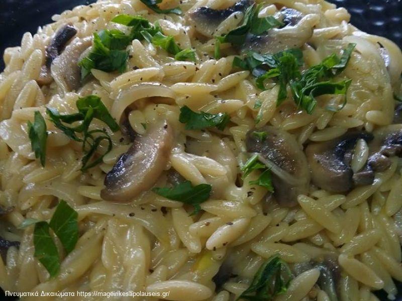 Εκτέλεση :σε αντικολλητικο σκεύος βάζω 1 κομμάτι βούτυρο και σοταρω τις φέτες κρεμμύδι όταν μελωσουν τις βγάζω σε πιάτο, στο ίδιο σκεύος το 2 κομμάτι βούτυρο και σοταρω τα μανιτάρια, τα βγάζω κι αυτά στο ίδιο πιάτο με τα κρεμμύδια, στο ίδιο σκεύος το 3 κομμάτι βούτυρο και ρίχνω το ψιλοκομμένο κρεμμύδι, μόλις σοταριστει λίγο προσθέτω και το κριθαράκι το σοταρω καλά, κατόπιν προσθέτω σιγά σιγά (όπως κάνουμε στο ρυζοτο)το νερό με τον ζωμό, αφού προσθέσουμε γύρω στα 600-800 ml και σωθούν τα υγρά προσθέτω τα υπόλοιπα υλικά, που είχα βγάλει στο πιάτο συν το κρασί, αφήνω λίγο να εξατμιστεί το αλκοόλ, προσθέτω λίγο ακόμη ζωμό αλάτι πιπέρι όταν είναι έτοιμο σβήνω το μάτι και προσθέτω το μετσοβονε, σερβίρω με μαϊντανό
