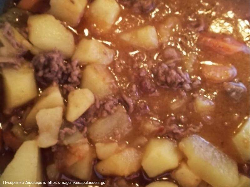 Τσιγαρίζουμε το κρεμμύδι, τις πιπεριές, τα καρότα, τους πελτέδες και μετά από 5' προσθέτουμε και τον κιμά και συνεχίζουμε το τσιγάρισμα. Προσθέτουμε και το σκόρδο. Τέλος βάζουμε μέσα στην κατσαρόλα μας τις πατατες, το χυμό ντομάτας, το νερό και όλα τα μπαχαρικά και ανακατεύουμε πολύ καλά να αναμιχθούν όλα τα υλικά. Σιγοβράζουμε το φαγητό μέχρι να βράσει καλά ο κιμάς και οι πατάτες και να μείνει μόνο με τη λαδιά του.