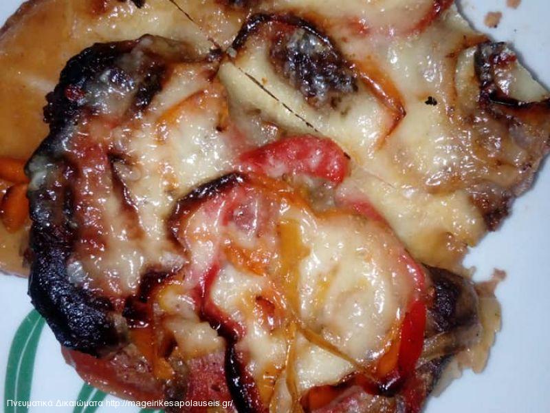 Ξανά ντομάτα κρεμμύδι και τις πιπεριές Όλα ροδέλες και ότι υγρά έχουμε από την μαριναδα με λίγο νεράκι...σκεπάζουμε και ψήνουμε σε 180° για μια ώρα..σκεπάζουμε και για μισή ώρα περίπου ψήνουμε να πιει τα υγρά και να πάρει χρώμα...Τελευταία πινελιά φέτες κασέρι..Για 5 λεπτά και σβήνουμε...