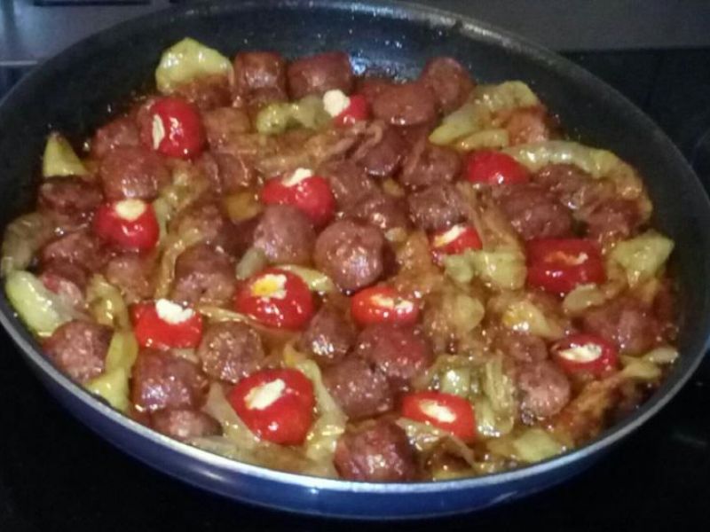 Στο τέλος, ρίχνουμε ολόκληρες τις γλυκοπικάντικες πιπεριές κεράσι και τις πικάντικες πιπεριές καρδούλες, αφήνουμε το φαγητό να πάρει άλλη μια βράση και σερβίρουμε.