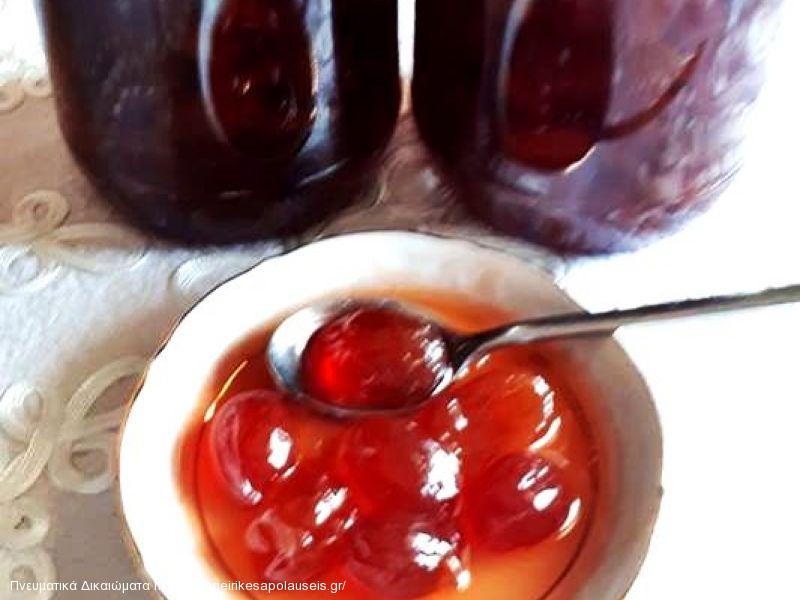 Σκεπάζουμε το γλυκό με μια λινή πετσέτα μουσκεμένη και στραγγισμένη πολύ πολύ καλά. Την επόμενη μέρα ξαναβράζουμε το γλυκό 20-25 λεπτά αφού προσθέσουμε τα φύλλα της αμπαρόριζας και στο τελευταίο 5λεπτο το ξυνό με το χυμό λεμονιού.