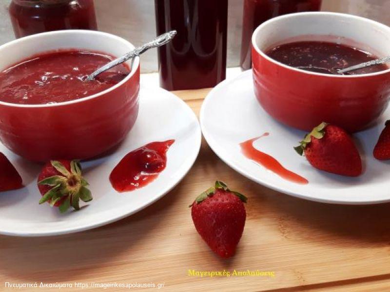 Πλένουμε καλά τις φράουλες και τις κόβουμε στην μέση. Τις βάζουμε σε μια κατσαρόλα και τις αφήνουμε στο ψυγείο για 10-12 ώρες. Μετα από τις ώρες που είπαμε βάζουμε σε δυνατή φωτιά και καθαρίζουμε τα τοιχώματα. Μόλις ξεκινήσει το βράσιμο παίρνουμε το μισό σιρόπι και συνεχίζουμε το βράσιμο για αλλά 15-20 λεπτά. Ρίχνουμε το λεμόνι μας και βάζουμε σε βάζα. Έπειτα ρίχνουμε το σιρόπι που έχουμε φυλάξει και μόλις ξεκινήσει το βράσιμο ρίχνουμε το λεμόνι και χαμηλώνουμε την φωτιά στην μέση. Αφήνουμε για μισή ώρα και βάζουμε σε μπουκάλια.